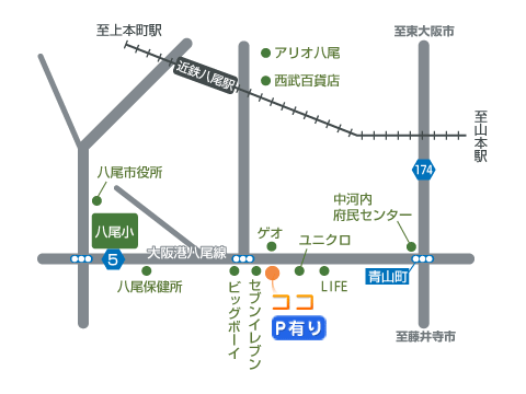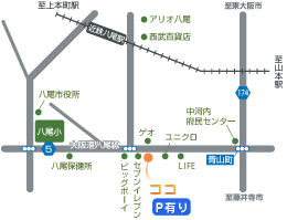 ・近鉄大阪線・近鉄八尾駅より南へ500m。 大阪港八尾線沿い。 ・駐車場は医院の東側にあります。